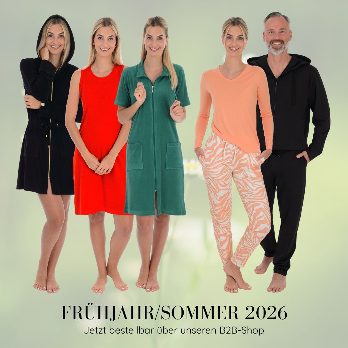 Unsere neue Frühjahr/Sommer-Kollektion ist bald da und bietet frische Impulse für Ihr Sortiment. Freuen Sie sich auf leichte Modelle aus Frottee-Stretch in frischen Farben sowie eine elegante Auswahl an Homewear.